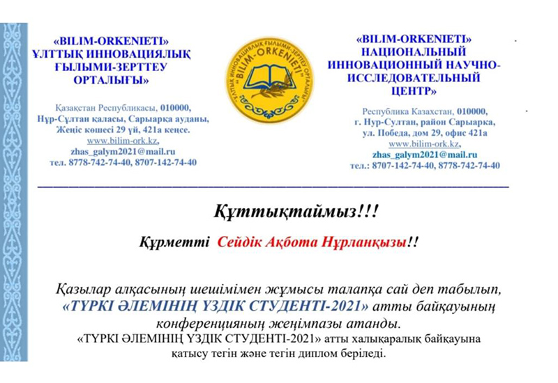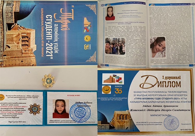 In October 2021, the National Innovative Research Center «Bilim-orkenieti» in honor of the 30th anniversary of Independence of the Republic of Kazakhstan held the republican contest «The Best student of the Turkic world-2021» in Nur-Sultan. It was attended by 3rd-year students of the Institute of Natural Sciences and Geography, majoring in Biology, Aidyn Aidana and Seydik Akbota, who wrote an essay on the topic «My achievements in student life». By decision of the jury, they became the winners of the competition for their contribution to the development of the youth policy of Kazakhstan, were awarded a diploma of the 1st degree, badges and a special certificate.
