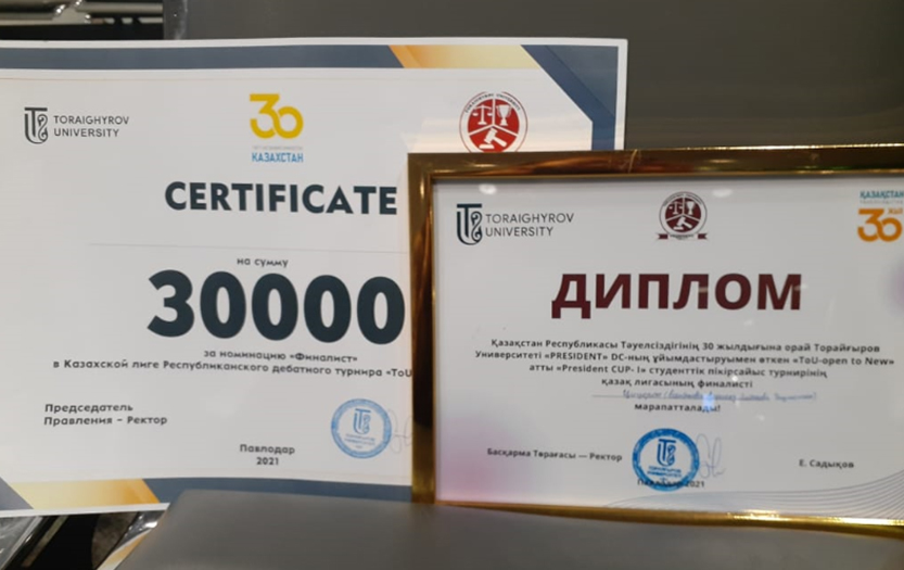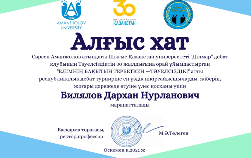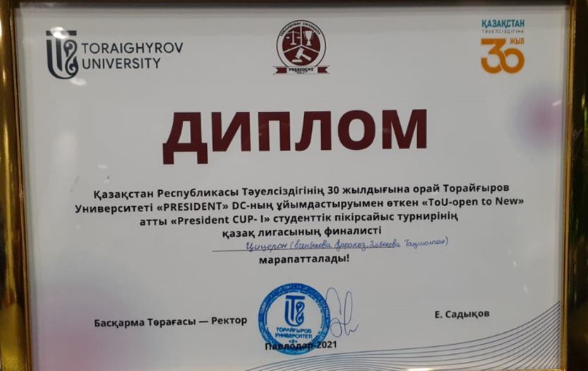 Also, our Karakoz, the finalist of the student debate tournament «PRESIDENT CUP-I», organized by Pavlodar State University named after S. Toraigyrov, took III place in the republican debate tournament among students «QORQYT ATA CUP» (Kyzylorda) and took part in the last Oskemen shares «ELIMNIN BAKYTYN TERBETKEN - TAUELSIZDIK». These events were held in honor of the 30th anniversary of the Independence of the Republic of Kazakhstan.