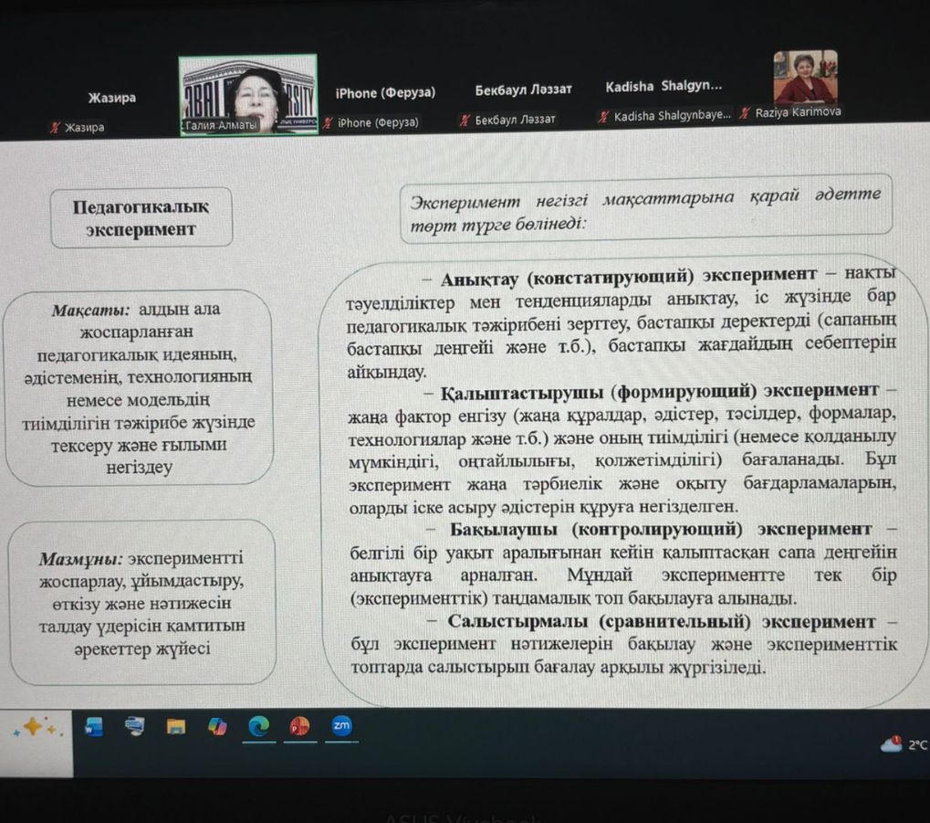Scientific and methodological seminar on «Empirical research in the field of preschool education» On February 3, 2026, G.Z. Taubaeva, Candidate of Pedagogical Sciences and Associate Professor of the Department of Preschool Education and Social Pedagogy, Faculty of Pedagogy and Psychology, Abai Kazakh National Pedagogical University, conducted a scientific and methodological seminar for 1st–2nd year doctoral students enrolled in the educational program 8D01201 – “Preschool Education and Upbringing.” During the seminar, each doctoral student became acquainted with research methods (theoretical and empirical) relevant to their research topics. These included verbal methods (conversation, question-and-answer, interview, survey), visualization methods (viewing images, demonstrations, observation of toys and objects), practical methods (exercises, modeling, experiments, productive activities), and game-based methods (didactic, role-playing, physical, and national games, as well as performing game activities). The seminar provided cognitive, methodological, systematizing, social, explanatory, and prognostic insights into the essence, main directions, methods, and approaches of professional activity. The lecturer emphasized that the seminar content offered essential theoretical knowledge and practical experience for future professional work. The scientific and methodological seminar was highly appreciated as an important practical platform contributing to the professional development of future educators.