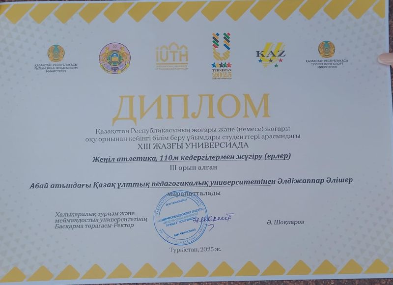 As part of the XIII Summer Universiade, held in Turkestan, a 3rd-year student of the specialty "Physical Culture and Sports" of Abai KazNPU Alisher Aldijappar took 3rd place and won a bronze medal in the 110-meter hurdles.