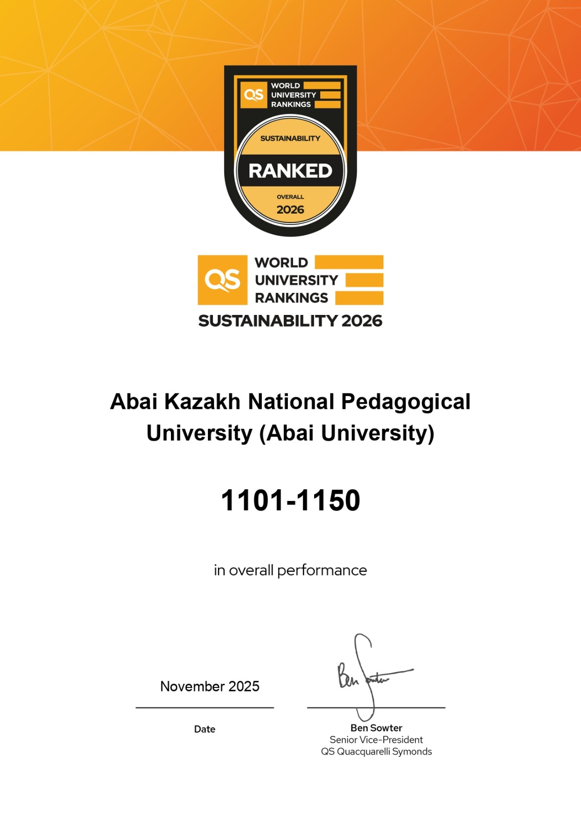 On 18 November 2025, the international higher education analytics agency QS Quacquarelli Symonds released the updated QS Sustainability Rankings 2026, which highlights the worlds leading universities committed to advancing sustainable development. The ranking includes 1,994 universities from 108 countries, including 827 universities from Asia and 23 institutions from the Republic of Kazakhstan. According to the results, Abai Kazakh National Pedagogical University demonstrated significant progress by rising 100 positions in the global ranking compared to last year, placing within the 1101–1150 band, which corresponds to 4th place among universities in Kazakhstan. This achievement reflects the university is systematic efforts to integrate sustainable development principles into its educational, research, and management activities. The university demonstrated particularly strong performance in the following criteria: · Good Governance – represents the quality of the university is management processes and development strategy. · Environmental Education – reflects the university is contribution to fostering environmental literacy and developing programs aimed at raising student awareness. · Environmental Research – ranked first among Kazakhstani universities, confirming the high level of scientific research in ecology and the environment. · Health & Wellbeing – ranked first among Kazakhstani universities, demonstrating its focus on creating a comfortable, safe, and supportive environment for students and staff.
