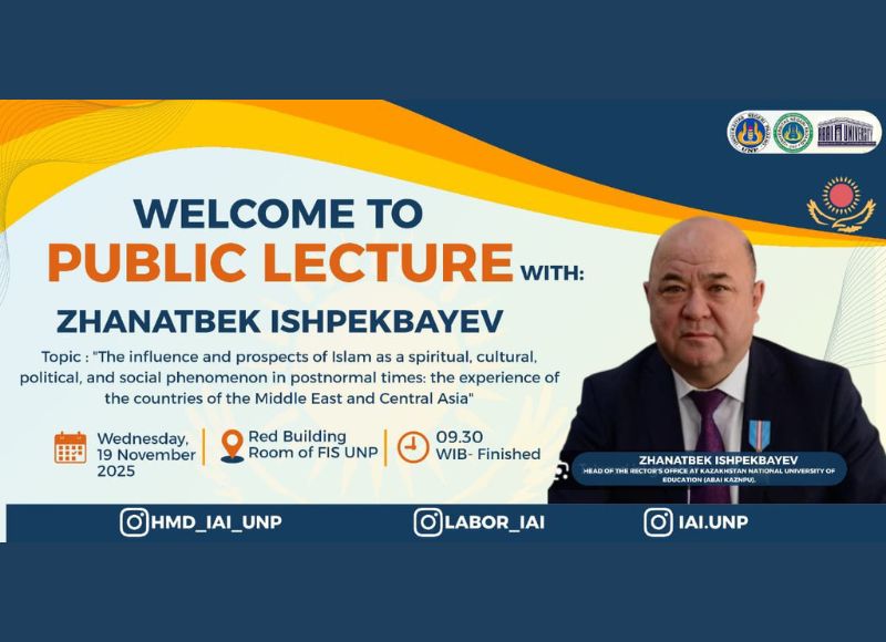 Within the framework of the targeted funding program and grant-funded projects of the Ministry of Science and Higher Education of the Republic of Kazakhstan, PhD Ertai Sultan, Vice-Rector for Research and Innovation of Abai KazNPU, and Zhanatbek Ishpekbayev, Head of the Rector’s Office and Candidate of Political Sciences, are currently on an academic visit to Padang State University. Candidate of Political Sciences Zhanatbek Eshenkhozhauly delivered a series of in-depth lectures on “The Influence and Prospects of Islam as a Spiritual, Cultural, Political, and Social Phenomenon in Post-Normal Periods: The Experience of the Middle East and Central Asia,” while Doctor of Philosophy Ertai Sultan presented a set of intellectually rich lectures on “Foundations of Artificial Intelligence in Literature: Revealing Key Mechanisms, Consequences, and Future Trajectories.”
