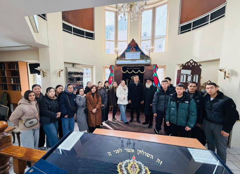 ҚазҰПУ Тарих және құқық факультеті, Гуманитарлық ғылымдар кафедрасының аға оқытушысы, PhD доктор Орынбеков Нұрлан Аманғазыұлының жетекшілігімен дінтану-саясат мамандығының 3-курс студенттері тәжірибелік сабақ аясында синагогаға барып, Қазақстанның Бас раввинімен кездесті. Кездесу барысында студенттер өздерін қызықтырған сұрақтарын қойып, қажетті мәліметтер алды. Учебно-познавательная экскурсия студентов 3 курса специальности «Религиоведение-политология» в синагогу