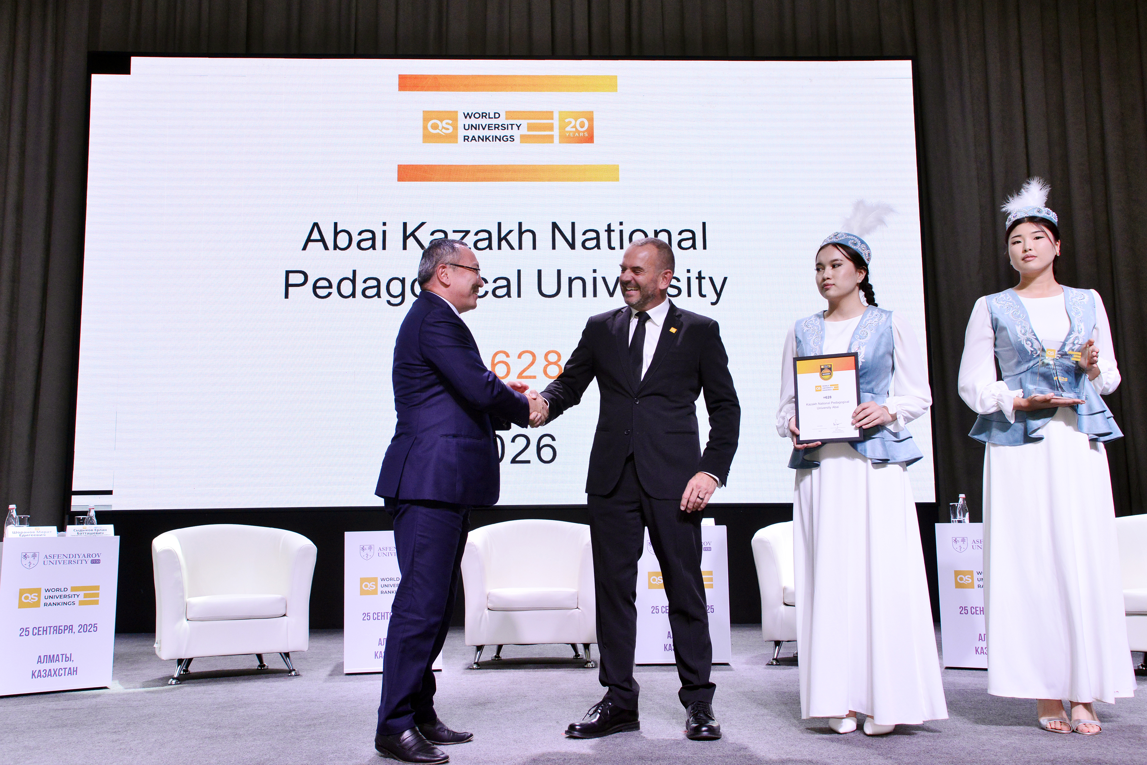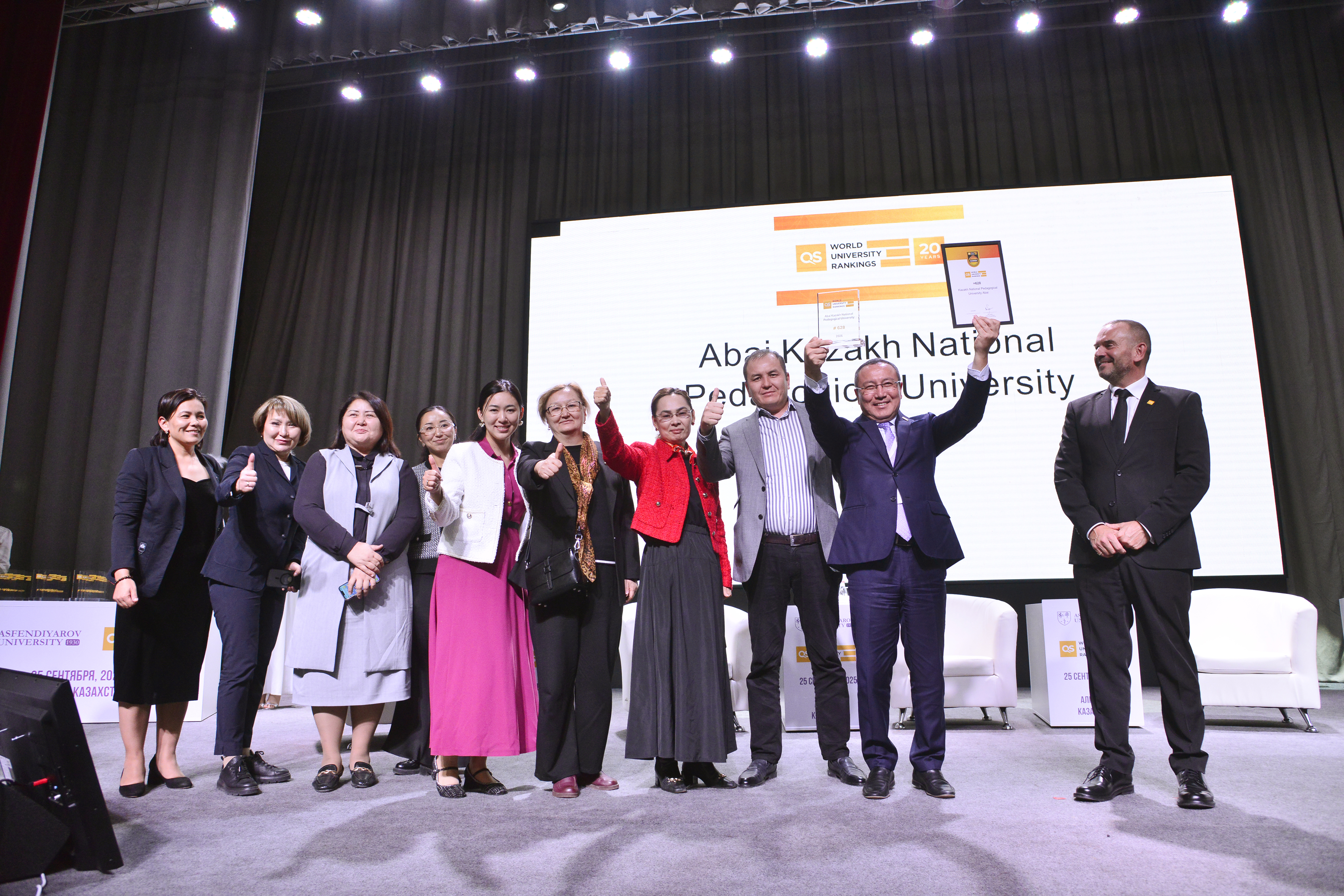 2025 жыл Абай университеті үшін халықаралық кеңістіктегі орны айқындалып, стратегиялық дамуы нақты нәтижелермен бекіген кезең болды. Жаһандық жоғары білім жүйесі цифрландыруға, тұрақты дамуға және халықаралық ықпалдастыққа бет бұрған шақта университет осы үрдістерге сай дамып, Қазақстан мен Орталық Азиядағы жетекші жоғары оқу орындарының бірі ретінде өз орнын нығайтты. Халықаралық рейтингтерге қатысу университеттің білім беру сапасын, ғылыми әлеуетін және жаһандық академиялық қауымдастықтағы беделін арттырудың маңызды факторына айналды. Бүгінде Абай университеті QS, THE, UI GreenMetric және Webometric сияқты әлемдік рейтингтерде бағаланып келеді. «QS World University Rankings – 2025» нәтижесі бойынша университет әлемдік тізімде 628-орынға көтеріліп, үздік 700 университет қатарына енді. Қазақстан университеттері арасында 4-орынды иеленіп, ұлттық деңгейдегі беделін арттырды. «QS Asia University Rankings – 2026» рейтингінде университет Азия бойынша 138-орынға, Қазақстан бойынша 4-орынға, ал Орталық Азия университеттері арасында 5-орынға жайғасты. Абай университеті «QS Stars Rating System» аясында жоғары бағаға ие болып, QS «Five Stars» («Бес жұлдыз») үздік белгісімен марапатталды. Бұл мәртебе университеттің білім беру сапасы, ғылыми-зерттеу қызметі, әлеуметтік жауапкершілігі, интернационалдандыру және басқару тиімділігі бағыттарындағы көрсеткіштерінің халықаралық стандарттарға толық сәйкес келетінін айғақтайды. QS «Бес жұлдыз» белгісі университеттің жаһандық академиялық кеңістіктегі беделін нығайтып, институционалдық дамуының жаңа деңгейге көтерілгенін нақтылайды. Пәндік рейтингтерде де университеттің академиялық әлеуеті айқын көрінді. «QS WUR by Subject – 2025» рейтингінде Education & Training бағыты бойынша университет төртінші жыл қатарынан әлемнің үздік 100 университеті қатарында қалып, Қазақстан бойынша көшбасшы орнын сақтап қалды. Сонымен қатар Arts & Humanities саласы бойынша әлемде 373-орынға, Қазақстанда 3-орынға ие болса, Modern Languages бағыты 101–150 диапазонында, Linguistics саласы 283-орында бағаланды. Тұрақты даму мен экологиялық жауапкершілік бағытында да университет елеулі нәтижелерге жетті. «QS Sustainability – 2026» рейтингінде университет 1101–1150 диапазонында орын алып, Қазақстанның үздік жоғары оқу орындарының қатарына кірді. «UI GreenMetric World University Rankings» нәтижесі бойынша 95 елден 1477 университеттің ішінде Абай университеті әлемнің үздік 500 университеті қатарына еніп, әлемде 422-орынға көтерілді. «Webometric» рейтингінде бір жыл ішінде университеттің 861 орынға өсуі цифрлық ашықтық пен академиялық беделінің артқанын көрсетеді. Академиялық қызметте студенттер контингенті 20 581 адамға жетіп, 2023 жылмен салыстырғанда 127,4 пайыздық өсім тіркелді. Оқытушы-профессорлық құрам 1 219 адам болып, оның 981-і – штаттық қызметкер. Ағылшын тілінде дәріс беретін оқытушылардың үлесі 21,1 пайызға жетіп, университеттің интернационалдандыру бағытының жүйелі түрде дамып жатқанын дәледеді. Халықаралық серіктестік аясындағы қосдипломдық бағдарламалар саны 25-ке артса, ал шетелдік студенттер саны 1 936 адамға жетті, бакалавриаттағы үлесі – 9,72 пайыз. Ғылыми-зерттеу қызметі университеттің педагогикалық зерттеу университетіне айналу бағытындағы дамуын айқындайды. 2025 жылы зерттеулер университет кірісінің 9,5 пайызын құрады, оқытушы-профессорлық құрамның 64,4 пайызы ғылыми жобаларға тартылды. «Scopus» деректер базасында жарияланымдар сан