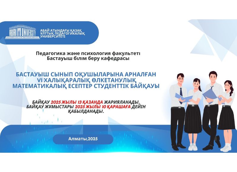 10.10.2025 Бастауыш сынып оқушыларына арналған VI Халықаралық өлкетанулық математикалық есептер студенттік байқауы Байқау 2025 жылғы 13 қазанда жарияланады. Байқау жұмыстары 2025 жылғы 10 қарашаға дейін қабылданады.