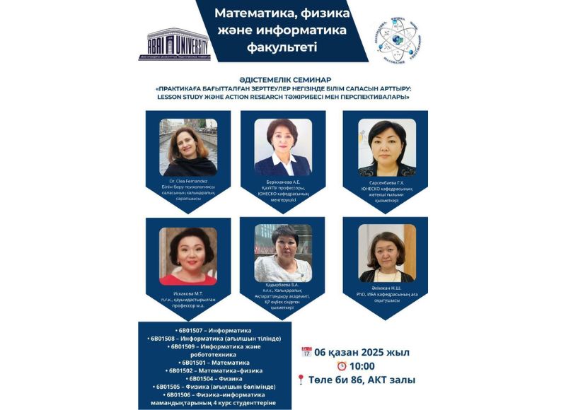 6 октября 2025 года под руководством проф. А.Е. Берикхановой, при участии приглашенного всемирно известного эксперта Dr. Clea Fernandez, ведущего специалиста, магистра педагогических наук, тренера и коуча Г.Х. Сарсенбаевой, сотрудника центра Зауре Ержановны, а также менторов факультета математики, физики и информатики - кандидата педагогических наук, заслуженного работника РК Б.А. Кадырбаевой, кандидата педагогических наук, ассоциированного профессора М.Т. Искаковой и PhD старшего преподавателя Н.Ш. Акимжан - был проведён университетский семинар на тему: «Повышение качества образования на основе практико-ориентированных исследований: опыт и перспективы Lesson Study и Action Research».