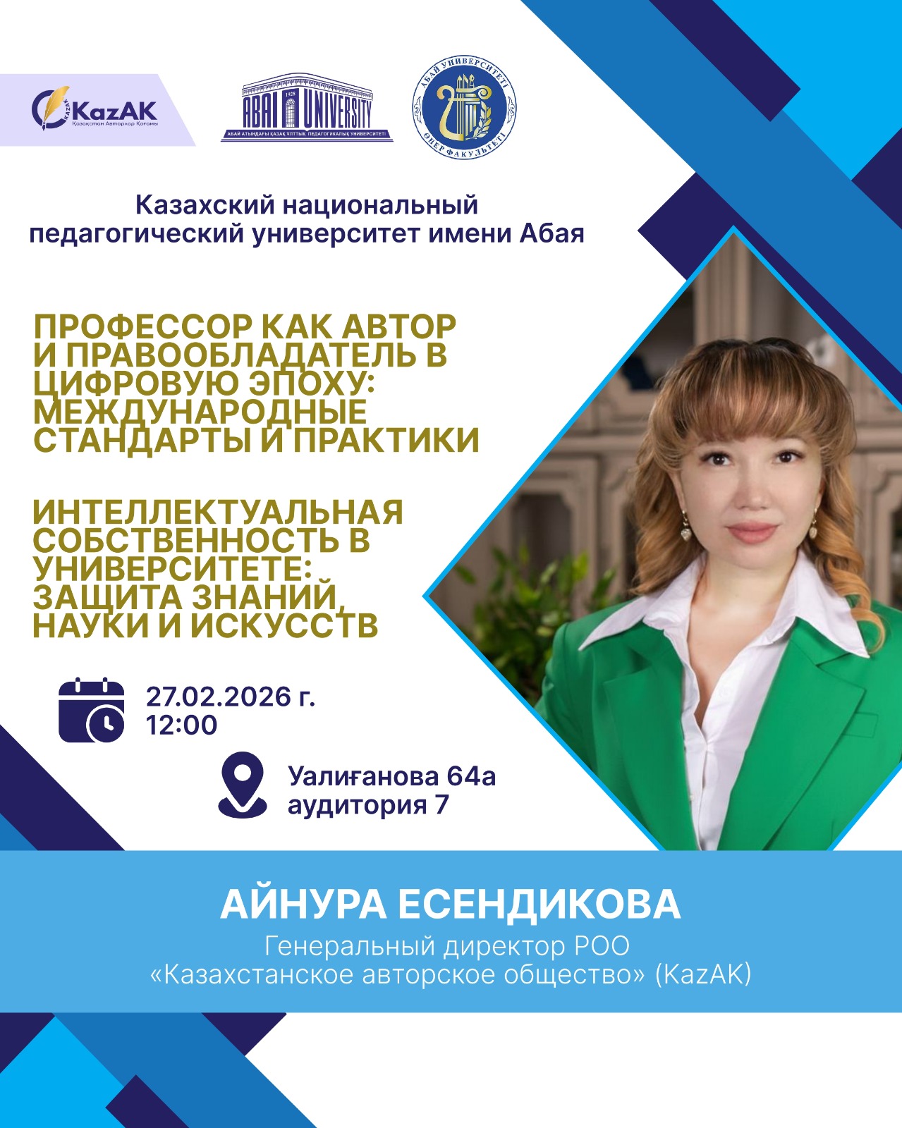 Спикером встречи выступила Айнура Есендикова, Генеральный директор Казахстанское авторское общество (KazAK). Она представила профессиональный взгляд на формирование культуры интеллектуальной собственности в университете, защиту прав авторов и предупреждение правовых рисков в цифровом пространстве.