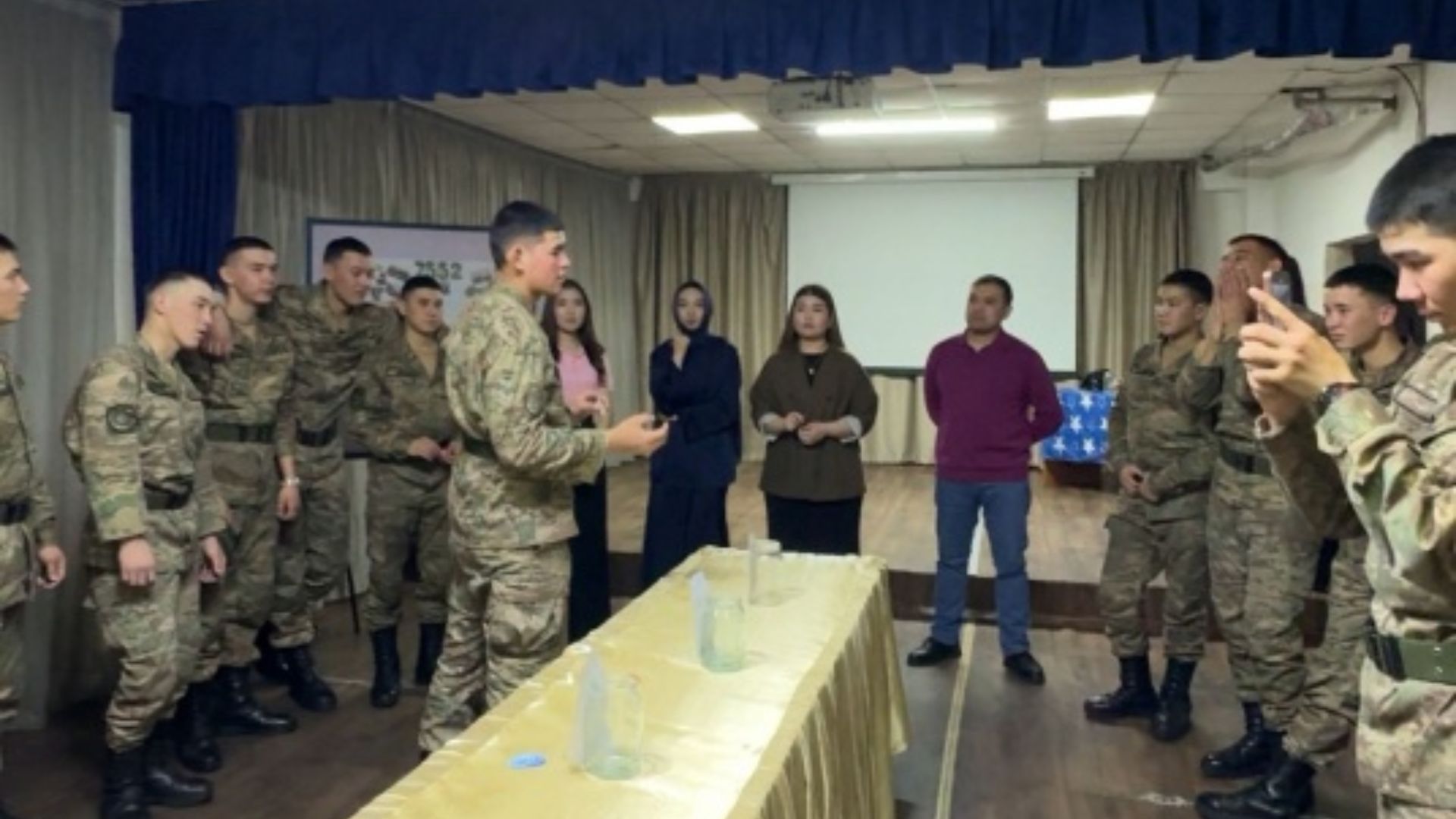 6B03111 – Производственная практика студентов 4 курса курса по ОП 6B03111 – Подготовка практического психолога! 1-го марта 2026 года был проведён тренинг на тему «Хорошая коммуникация – залог сильной команды». Цель мероприятия – повышение сплочённости в военной среде, укрепление единства и взаимной поддержки, а также формирование культуры благодарности.В тренинге приняли участие военнослужащие подразделения, а также заместитель командира роты старший лейтенант Абдыкалыков Даулет, лейтенант Анарбаев Мейірбек и руководитель практики Тукебаева Саулет. В ходе тренинга участники активно участвовали в разминках и групповых заданиях, что способствовало развитию взаимного доверия и улучшению коммуникации. В заключительной части была организована рефлексия, в рамках которой военнослужащие выразили благодарность друг другу. Проведённый тренинг способствовал укреплению командного духа, взаимного уважения и поддерживающей атмосферы в коллективе.