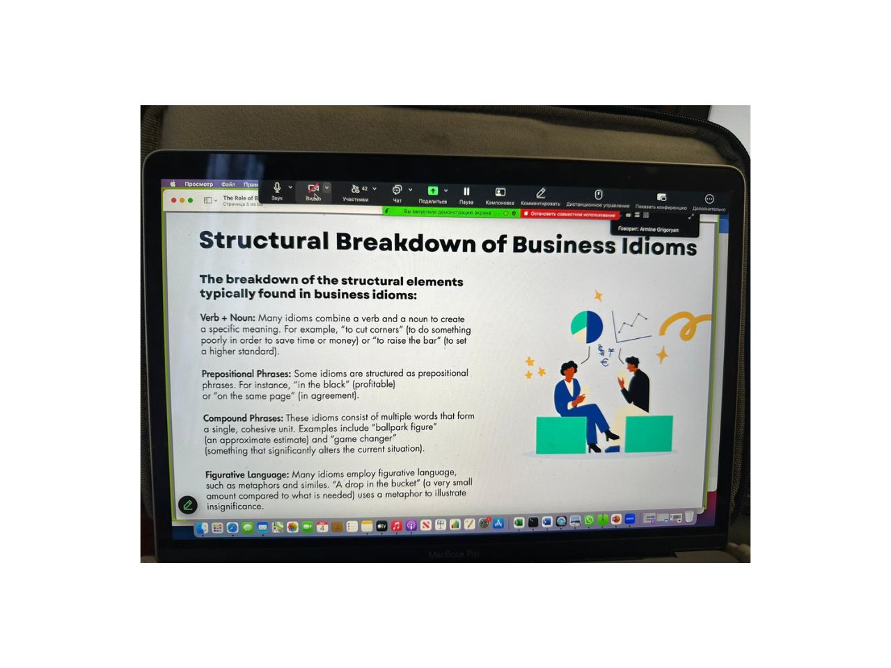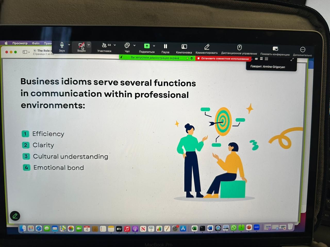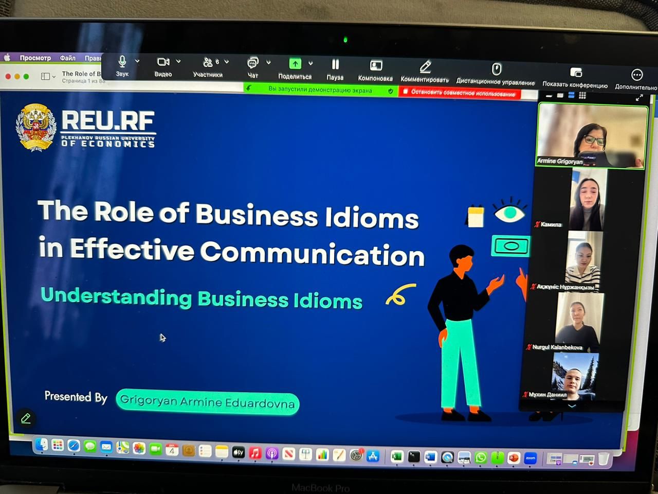 04 декабря 2025 года для студентов и магистрантов специальности «Переводческое дело» кафедры восточной филологии и перевода была прочитана онлайн-лекция «Роль деловых идиом в коммуникации. Перевод деловых идиом: проблемы, стратегии и решения». Спикером выступила Григорян Армине Эдуардовна – старший преподаватель, научный сотрудник кафедры №2 Российского экономического университета им. Г.В. Плеханова. Лекция вызвала большой интерес, студенты и магистранты задавали много вопросов, т.к. данная тема актуальна и тесно связана с будущей профессией обучаемых.