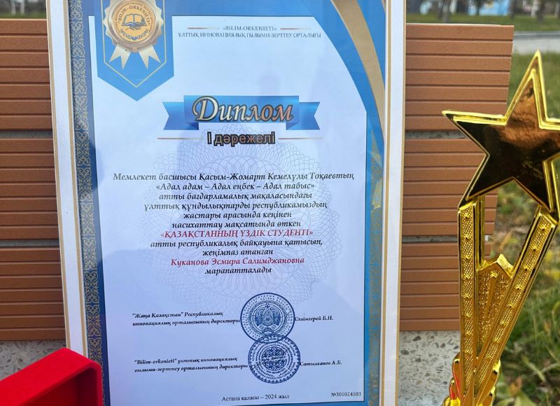 07.11.2024 Студент Abai University победитель конкурса «100 лучших студентов Казахстана» 6 ноября 2024 года в Астане состоялась торжественная церемония награждения победителей конкурса «100 лучших студентов Казахстана». В мероприятии приняли участие студенты из разных регионов страны, показавшие лучшие результаты в учебе. Целью конкурса является популяризация национальных ценностей среди молодежи Казахстана. Эсмира продемонстрировала выдающиеся способности и искреннюю страсть к обучению. Поздравляем нашу студентку с заслуженной победой!