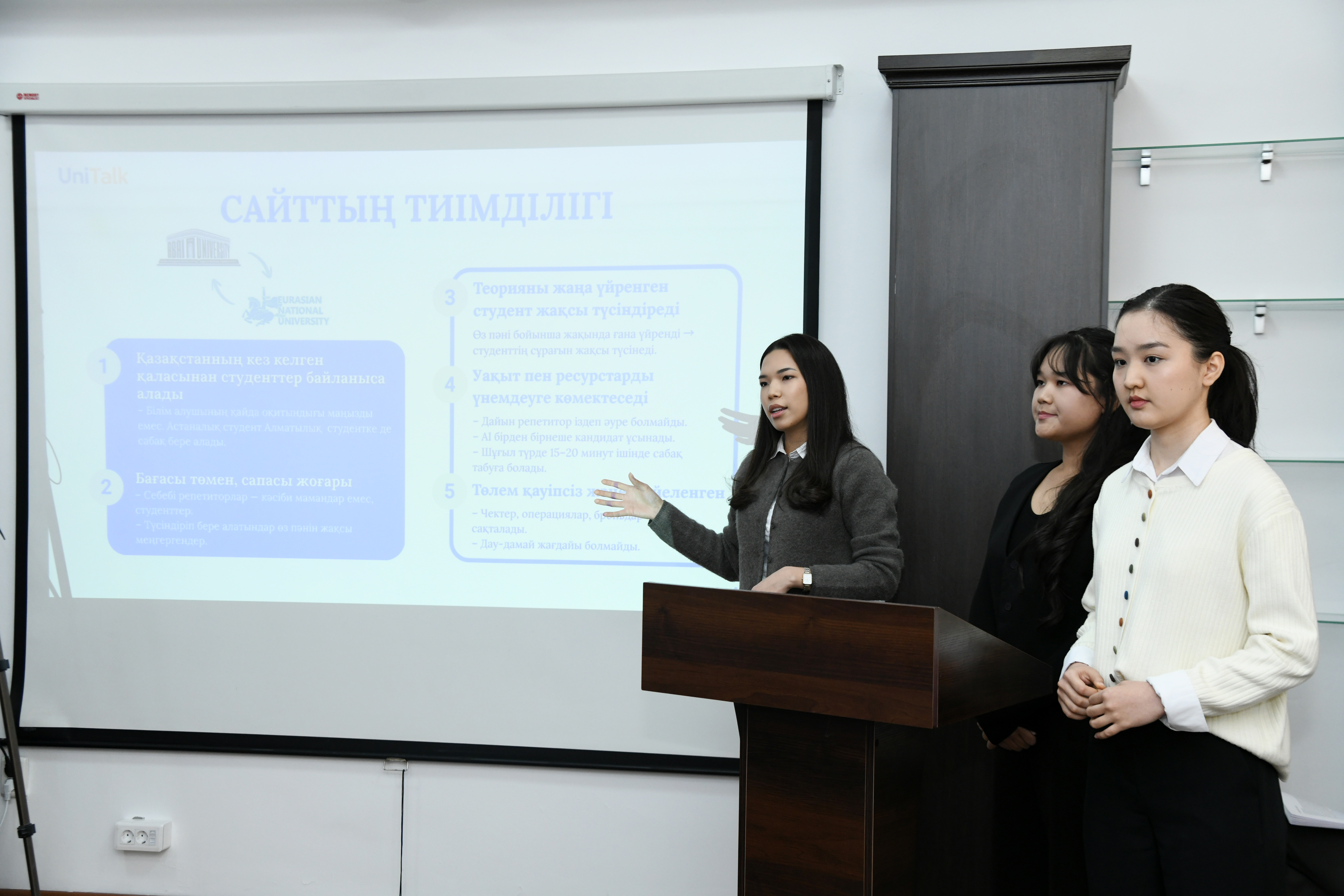 Также был презентован проект «Unitalk», направленный на повышение качества образования. Здесь у студентов есть возможность найти репетиторов по различным предметам и выбрать время онлайн-занятий. Не только дипломированные специалисты, но и обучающиеся здесь могут работать репетиторами для учащихся. В проекте искусственный интеллект готовит вопросы для дифференциации знаний учащегося,определения уровня.
