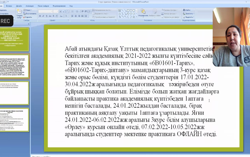 2022 жылдың 24 қаңтарда Тарих және құқық институты Әлем тарихы кафедрасының ұйымдастыруымен педагогикалық практикаға ашылу конференциясы онлайн форматта өткізілді. Конференцияға Тарих және құқық институты директорының оқу ісі жөніндегі орынбасары Д.Б. Асымова, педагогика ғылымдарының докторы, профессор Г.С Саудабаева, психолог аға оқытушы М.Б. Құрманбек және Әлем тарихы кафедрасының меңгерушісі аға оқытушы К.М Рүстем, практика әдіскерлері мен бірге «6В01601-Тарих», «6В01602-Тарих-дінтану»» мамандықтарының 3-ші курс студенттері қатысты.