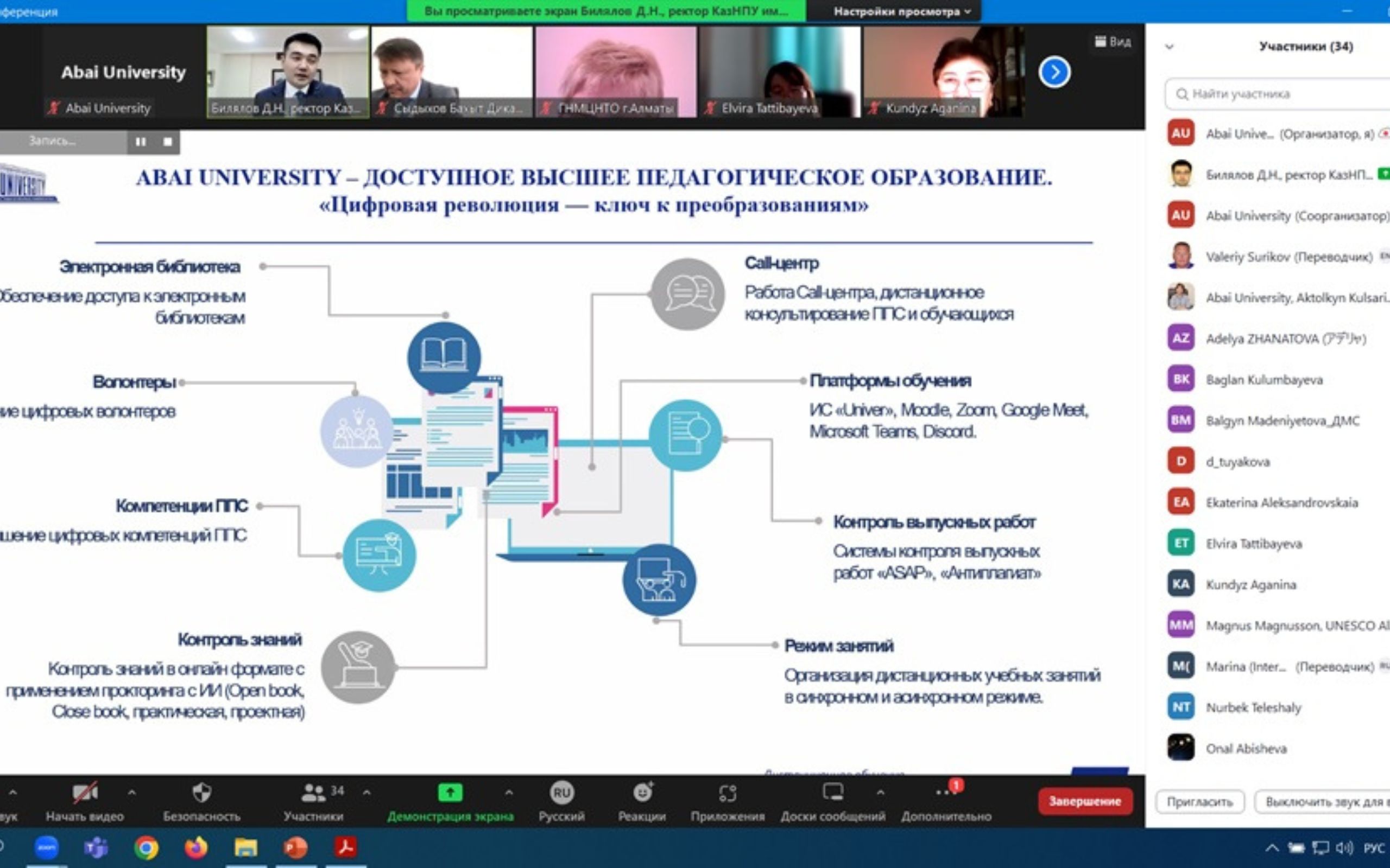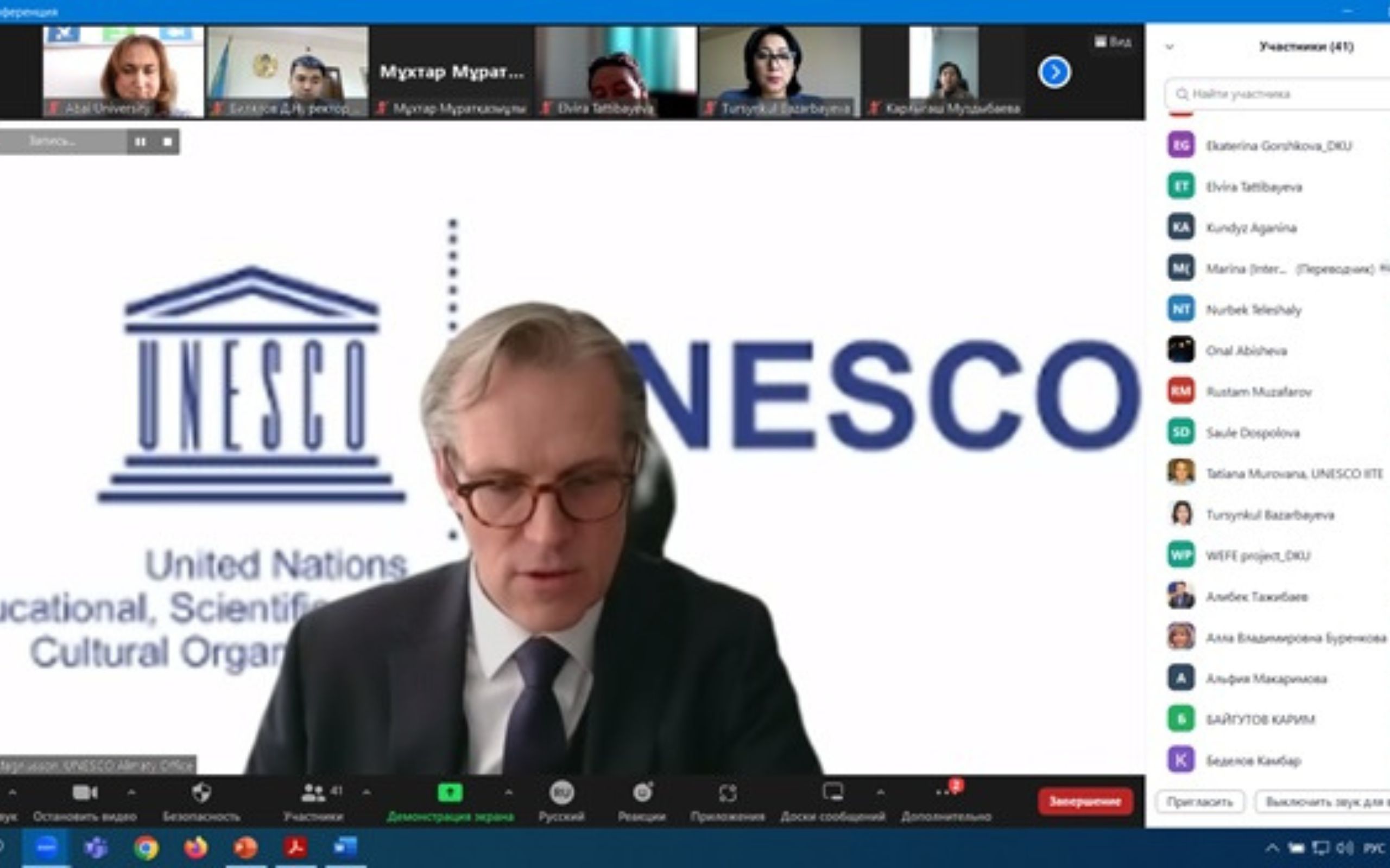 Спикеры вебинара - ректор КазНПУ им. Абая Дархан Билялов, и.о. директора Кластерного бюро ЮНЕСКО в Алматы по Казахстану, Кыргызстану, Таджикистану и Узбекистану Магнус Магнуссон, директор Центра аналитических исследований «Евразийский мониторинг» Алибек Тажибаев, руководители кафедр ЮНЕСКО в Казахстане: Меруерт Абусеитова - директор Республиканского информационного центра по изучению исторических материалов, руководитель кафедры ЮНЕСКО «Наука и духовность» Института востоковедения имени Р.Б.Сулейменова, Барбара Януш-Павлетта - вице-президент по международному сотрудничеству и устойчивому развитию Казахско-Немецкого университета, Турсынкуль Базарбаева - заведующая кафедрой ЮНЕСКО по устойчивому развитию при КазНУ им. аль-Фараби; Программный специалист Института ЮНЕСКО по информационным технологиям в образовании Татьяна Мурована; начальник отдела сопровождения стратегии развития КазНПУ им. Абая Баглан Кулумбаева, методист Городского научно-методического центра новых технологий в образовании Светлана Шапкина. Они поделились опытом реализации Целей устойчивого развития, методическими разработками. Также были рассмотрены вопросы сотрудничества по таким направлениям, как инклюзивное, справедливое вузовское образование; роль критического мышления и навыков дискуссии в профессиональной сфере для жизни, работы и устойчивого развития; «зеленые» и цифровые технологии.