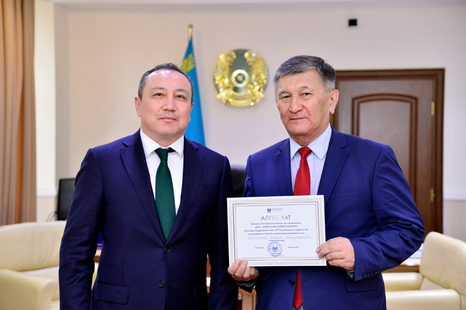 The team leader is candidate of chemical sciences, associate professor Khanat Dyusebayev. The Rector of the University congratulated our winners on their achievements and thanked the teachers of the Department of Chemistry who prepared the team.