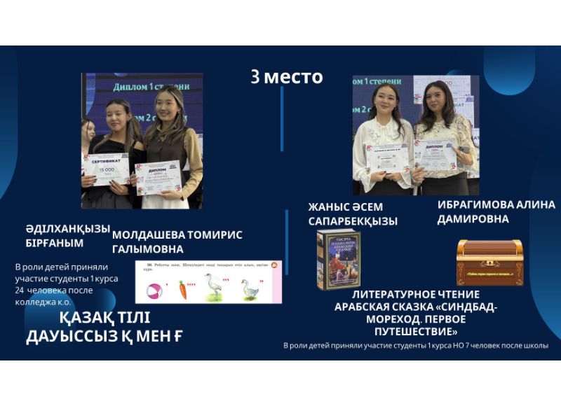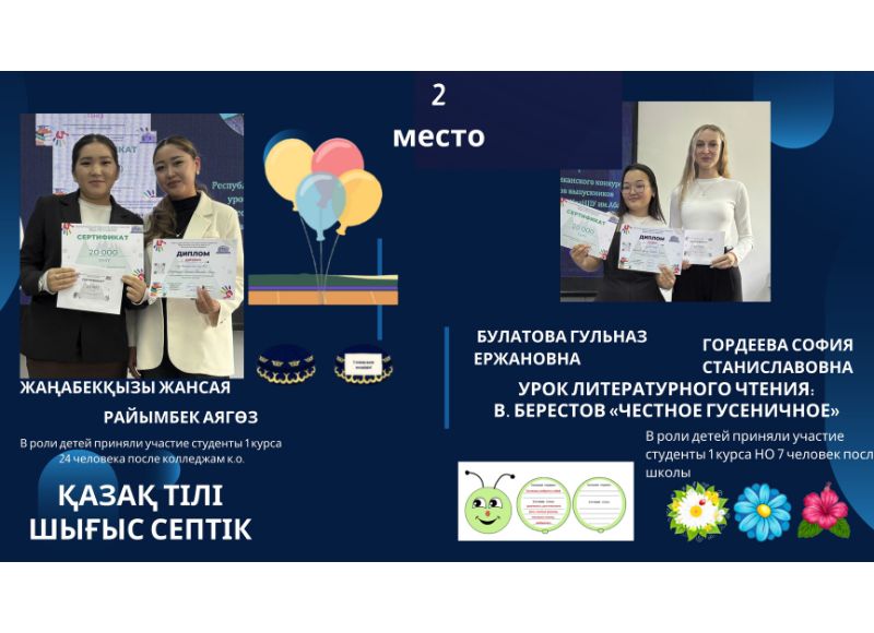 2025 жылғы 3 қазанда Абай атындағы ҚазҰПУ-дың Бастауыш білім беру кафедрасында түлектер сабақтарының «Жаңа буын мұғалімі» бірінші республикалық конкурсының финалы өтті. Конкурс бірінші курс пен бітіруші курс студенттерін біріктіріп, мектептегі білім берудің заманауи тәсілдерін көрсетті. Жобаның авторы және үйлестірушісі – Абай атындағы ҚазҰПУ профессоры Акпаева А.Б. Жобаның меценаты – Абай атындағы ҚазҰПУ профессоры Лебедева Л.А. Конкурсқа Қазақстан мен Ресейдің 4 жоғары оқу орнынан 19 өтінім қабылданды (Абай атындағы ҚазҰПУ, А.Байтұрсынұлы атындағы Қостанай өңірлік университеті, Алматы гуманитарлық-экономикалық университеті, Р. Гамзатов атындағы Дағыстан мемлекеттік педагогикалық университеті). Конкурс екі кезеңде өтті. Бірінші кезеңде барлық жұмыстар талданып, қазылар алқасының құрамына «Bilimkana-Almaty» жекеменшік мектебінің мұғалімі Козленко А.С., Қазақ ұлттық қыздар педагогикалық университетінің профессор м.а. Агеева Л.Е., Х.Досмұхамедов атындағы Атырау университетінің профессоры Кинжибаева Ф.Б., Алматы қаласындағы №110 мектеп-гимназияның бастауыш сынып мұғалімі Бокотова А.Е. кірді. Байқаудың финалына тікелей қатысуға шақырылған бес жұмыс және тікелей қатысусыз бір жұмыс өтті. Қатысушы студенттер сабақтарының бейнероликтерін көрсетіп, әдістемелік идеяларын қорғады, ал бірінші курс студенттері өз әсерлерімен бөлісіп, сұрақтарға жауап берді. Финалдық кезеңнің қазылар алқасы: төраға – Абай атындағы ҚазҰПУ Бастауыш білім беру кафедрасының меңгерушісі Жұмабаева А.Е.; Педагогика және психология факультеті деканының орынбасары Ақжолова А.Т.; Бастауыш білім беру кафедрасының ПОҚ құрамы – профессор Лебедева Л.А.; аға оқытушылар Жораева С.Б., Абдыкадыров А.О., Ауесхан А.; сондай-ақ STEAM мектеп-лицейінің педагог-зерттеушілері – Хузина Е.В. және Боброва О.В. Қазылар шешімімен төмендегі дипломдар берілді: I дәрежелі – Евсеева Регина Владимировна және Ткаченко Анастасия Евгеньевна (Абай атындағы ҚазҰПУ); II дәрежелі – екі дуэт: Жаңабекқызы Жансая мен Райымбек Аягөз және Булатова Гүлназ бен Гордеева София (Абай атындағы ҚазҰПУ); III дәрежелі – үш дуэт: Әділханқызы Бірғаным мен Молдашева Томирис, Жаныс Әсем мен Ибрагимова Алина (Абай атындағы ҚазҰПУ), сондай-ақ Никулина Дарья мен Бурдяковская Наталья (А.Байтұрсынұлы атындағы Қостанай өңірлік университеті). Арнайы номинациялар да жарияланды. Конкурс қорытындылары еліміздің болашақ педагогтарының жоғары әлеуетін және заманауи білім беру тәжірибелерін енгізуге дайындығын айқындады. Қатысушыларға, қазылар алқасына және тәлімгерлерге сенімі мен серіктестігі үшін алғыс айтамыз.