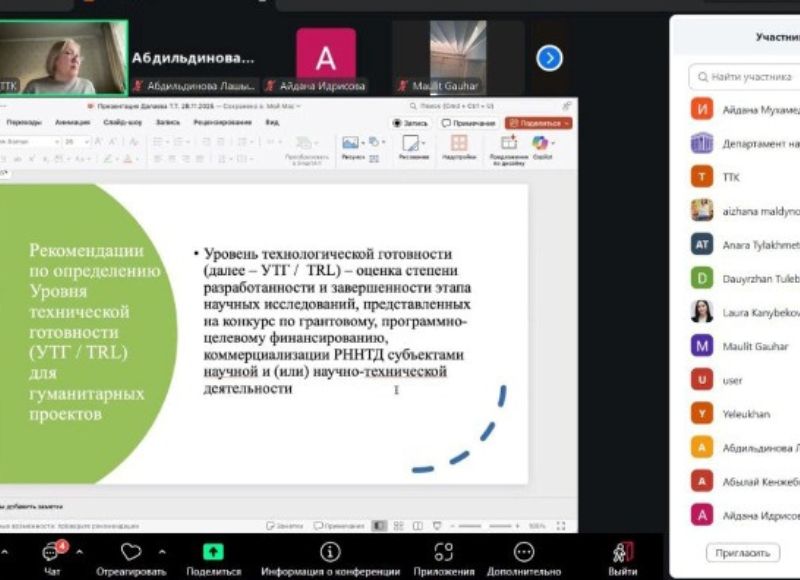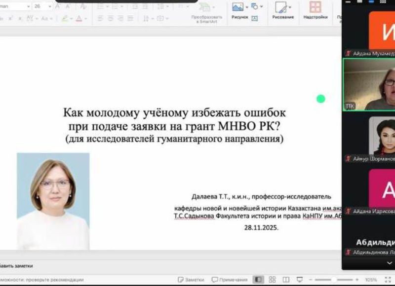 28 ноября 2025 г. состоялся вебинар «Как молодому учёному избежать ошибок при подаче заявки на грант МНВО РК? (Для молодых исследователей гуманитарного направления)». С презентацией выступила Тенлик Токтарбековна Далаева, к.и.н., профессор-исследователь кафедры новой и новейшей истории Казахстана им. академика Т.С. Садыкова Факультета истории и права. Цель научного вебинара состояла в том, чтобы сформировать у молодых исследователей гуманитарного направления представление о практических навыках подготовки качественных заявок на грантовое финансирование МНВО РК, с акцентом на правильный выбор конкурса и корректное обоснование конечных результатов. Отдельное внимание было уделено вопросам методики определения уровней готовности технологий для гуманитарных и социальных наук. Были сформулированы рекомендации по правильному определению уровней готовности технологий для конкурсов молодых ученых в РК. Молодые исследователи КазНПУ имени Абая проявили интерес и были активны на вебинаре.