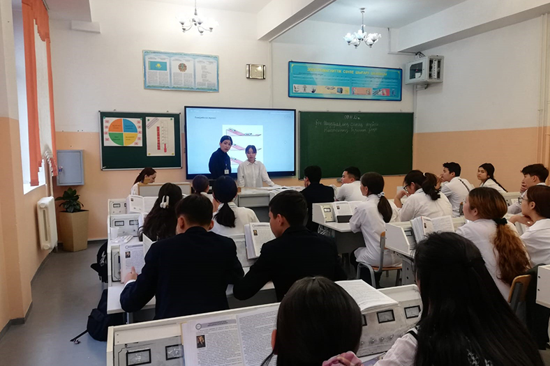 An open lesson of the 4th year student of the specialty «6B01505-Physics with English language of instruction» of the Institute of Mathematics, Physics and Computer Science Ibraimova Shakhnoza was held at the Lyceum School №33 in the presence of Vice rector for research activities and innovation of Abai KazNPU Ermek Buribayev. There were also present representatives of the university and school.